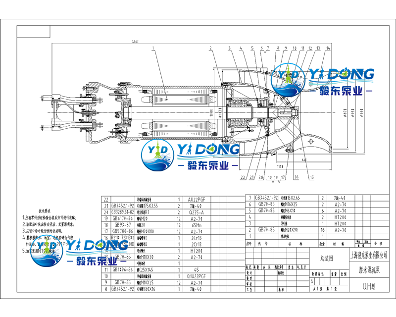 本公司潜水泵名义出水口径有350、500、600、700、800、900、1000、1200、1400、1600共计十种口径,流量范围0.1~12m3/s,扬程范围2~14m;功率范围7.5~630kw;电压等级380V、660V、3kV、6kV、10kV。QH型潜水混流泵使用不超过50℃的清水或物理化学性质类似于水的其他液体,其最高被输送液体温度为40℃。