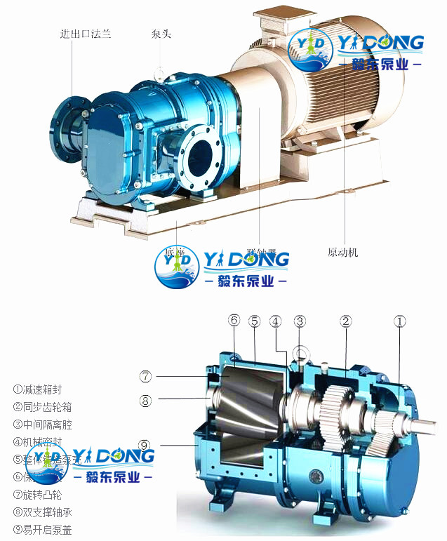 HZB型转子泵工作原理是当动力带动传动轴传递扭矩时,主动轴驱动齿轮箱内的一对同步齿轮及固定在泵轴上的二个转子做相对运动,使泵吸入端产生真空,排出端形成负载压力,来达到输送液体介质的目的。泵连续转动时,在转子的相对作用下,泵轴每转动一转便由六次满载的液体介质排出。动力机的转向决定了泵输送介质的方向,无正反转之分,在规定的转速范围内泵的流量大小与泵的转速成正比。