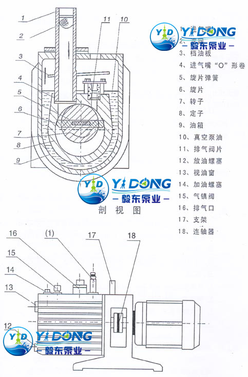 2XZ型双级旋片式真空泵系双级偏心式旋片结构,电动机和泵通过联轴器固定在底座上,泵由泵体、高转子、低转子、前端板、后端板、高转片、低转片、排气阀、排气罩、视镜等零部件组成。在泵体内压入一个中隔板、将泵壳分成高低真空室,各室都有排气门,高真空室排气与低真空室进气相通。高转子前端伸出前轴;后端伸出后轴。前轴通过前端板的轴承支持、经过油密封室而伸出前端板外:后轴由中隔板上的轴承支持。而伸入低真空室内,低真空室转子则装在后轴上、故高低转子均由前轴带动。高低转子都有对开的槽子,呈“T”形的旋片由弹簧开而装于槽内。泵的进气口处有过滤网,而排气口处有挡油网,视镜左边有掺气阀,下边有放油塞。2XZ型双级旋片式真空泵有偏心装置,泵孔内的转子及转子槽内旋片,转子带动旋片旋转时,旋片紧粘腔壁把进排气口分割开来,并使进气积腔容积周期性地扩大而吸气,排气腔容积则周期性缩小气体,推开排气,从而获得真空。