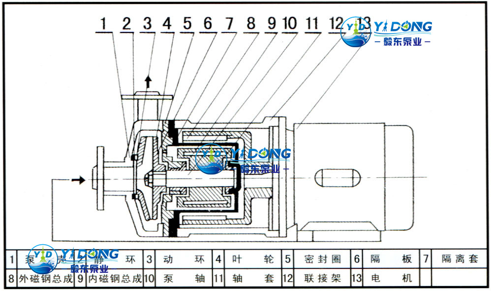 CQ型磁力泵(即磁力驱动泵)是将永磁联轴器的工作原理用于离心泵的新产品,采用内外磁钢推拉传递,磁路中间用隔离套将液体封闭在隔离套内,以静密封代动密封,当原动机带动外磁钢转子时,通过磁场的作用驱动内磁钢转子同步旋转,而内磁钢转子和叶轮连成一体,从而达到无接触带动叶轮转动之目的。由于液体被封闭在静止的隔离套内,所以磁力泵是一种全封闭、无泄漏的泵型,彻底解决了其它泵机械密封无法避免的跑、冒、滴漏之弊病。CQ型磁力泵是我司技术人员参考了大量国内外有关资料,按照国标JJB/T774295标准生产,其技术性能达到国外同类产品的选进水平。泵的最高效率达到50-55%,泵的设计过程是充分考虑了节能。而且CQ型磁力泵结构简单,主要部件模块化,以便于简便快速成的拆卸和检查,易损件可单独更换。