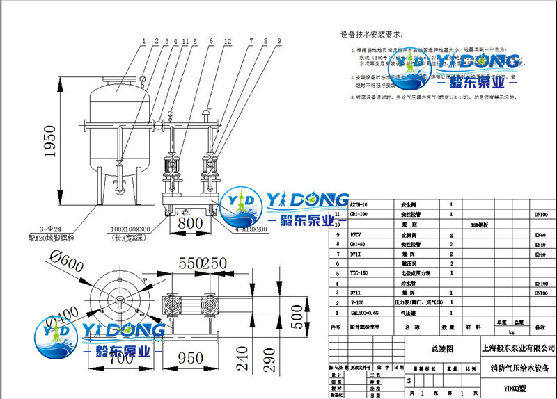 YDXQ型消防气压给水设备是由隔膜气压罐、水泵机组、专用消防控制柜及管路辅件组成,在水泵启、停状态均能向消防管网供水的设备。消防增压稳压给水设备由稳压泵两台一用一备,隔膜式稳压罐一台,电控柜一台,仪表阀门及组合管网各一套,组成了隔膜式稳压供水设备。