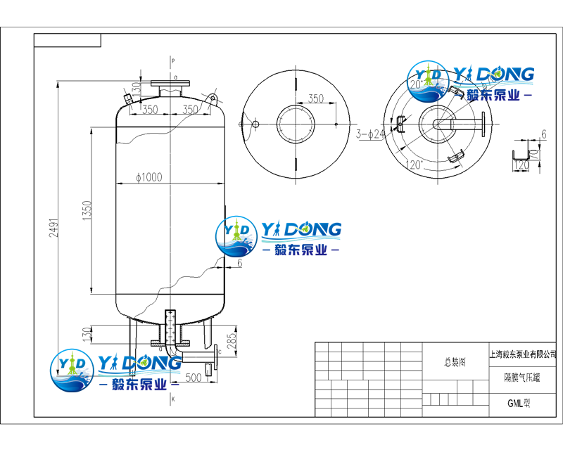 4.GM型隔膜气压罐出厂,预充压力已设定,一般在1bar-4bar,用户若认为压力不适合本系统运行,须使用压力表边测试边充、放气。
