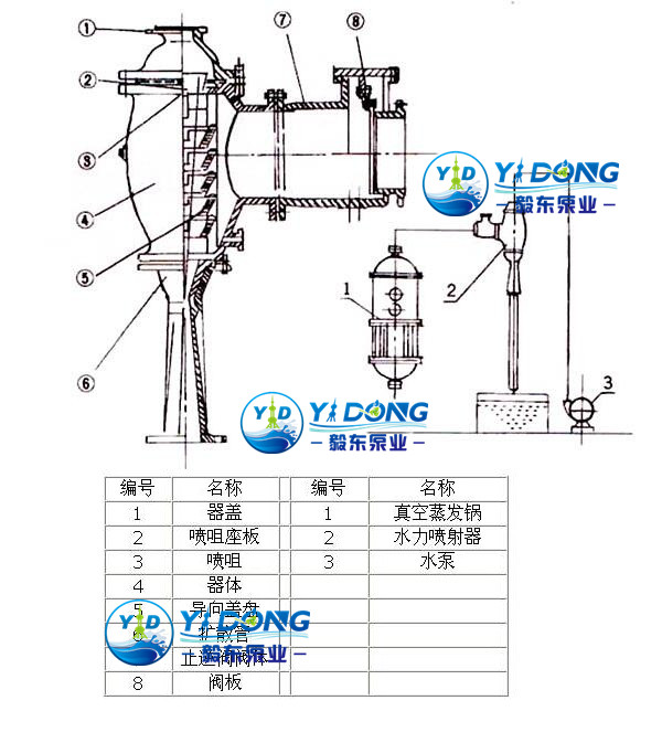 W型水力喷射器由器体、器盖、喷咀、喷咀座板、导向盘、扩压管及单向阀等部件组成,喷咀用不锈钢制造,喷咀座板由优质钢加工,其余零件则系铸铁铸造。喷咀采用多喷咀的结构形式,以便得到较大的水—汽接触,有利于热交换的进行,获得较好的真空效果。喷咀座板加工精密,精度较高,以使喷射水流准确地聚集在同一的焦点。导向盘用于减慢蒸汽(或空气)的流速,使蒸汽均匀地导入器室以免喷射水流偏斜,降低抽射效能。整个装置结构紧凑精密,强度高,用于真空蒸发系统中,由于能把冷凝器的冷凝作用与真空泵的抽气作用合并在一个设备中同时完成,大大地简化了工艺流程,比之原来真空泵加旧式冷凝器的装置,可以节省去真空泵、冷凝器、分水器等设备。