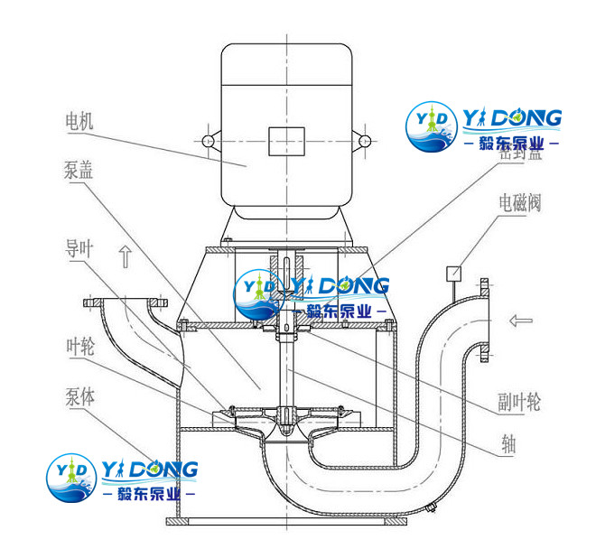 YDWF型无密封自控自吸泵主要由泵体、叶轮、泵盖、导叶、副叶轮、泵轴、连接架、电动空气控制阀等部分组成。该泵体内部由吸入室、储液室、气液分离室等部分组成。泵在正常起动后,叶轮将吸入室所存的液体及吸入管路中的空气一起吸入,液体混合气体在叶轮高速旋转的离心力作用下经导叶抛入气液分离室,由于流速突然降低,气体与液体的比重不同,较轻的气体从混合液中分离出来并被排出泵外,脱气的液体重新进入工作腔与叶轮内部从吸入管路中吸入的空气再次混合,在叶轮的旋转的作用下,很快使泵体入口形成一定的真空度,从而达到自吸的目的。由于YDWF型无密封自控自吸泵具有独特的排气功能,因此该泵能输送含有气体的液体并无须安装底阀。该泵配有“电动空气控制阀”运行时,控制阀关闭,实现密封;停机后控制阀打开,破坏了吸入管路中的真空,防止停机后泵腔内的液体因缸吸作用而众吸入管路流出,使泵腔内保存足够的液体来继续完成自吸过程,从而实现了“首次引流、永久自吸”。