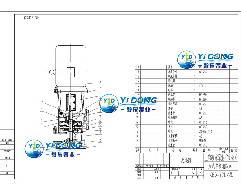 XBD-YDDX型电动消防泵执行JB/T2727-93《立式多级简型离心泵型式与基本参数》标准,其吸入、排出口分别位于进、出水段上。转子部件由轴、叶轮、叶轮挡套、轴套等零件组成,进水段、中段、出水段用拉紧螺栓联结。轴封采用软填料密封或机械密封,用平衡室的压力水进行润滑和冷却。完全满足现行的消防规范和国家消防局规定的消防供水工况范围要求,进出口相对位置可调整至四个方向,性能可靠、运行平稳,使用寿命长,机械密封便拆式结构,维修方便。
