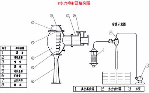 水力喷射泵工作系统由水泵、水力喷射泵、管路、阀门、水汽分离器及测试仪表等组成,常用系统有立式和卧式两种安装方式。