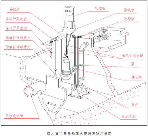 在这种安种形式中,泵与耦合装置相连,耦合底座固定于泵坑低部(在建造污水坑时,与预埋好地脚螺栓,使用时将耦合底座固定即可)泵可以在导轨中上下自动移动,当泵放下时,耦合装置自动地与耦合底座耦合,而提升泵时与耦合底座自动脱离。 这种方式可根据用户要求配备液压开关,中间端子箱及全自动保护控制柜。在选型时,应注明泵的型号、安装方式、池深、泵控制保护方式,以便提供最优的系统。如用户特别需要,我厂可提供特种材料的WQ型潜水排污泵。