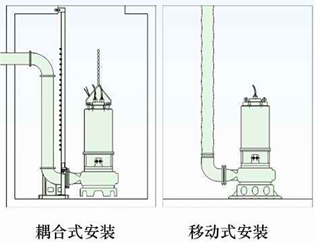 6)WQ无堵塞潜水排污泵有两种不同的安装方式,固定式自动耦合安装系统、移动式自由安装系统。配备双导轨自动耦合安装系统,它安装、维修带来更大方便,人可不必为此而进进污水坑。移动式自由安装系统移动方便,可根据客户不同区域的要求,在排污泵的出水弯头上接出水水带即可快速排水。