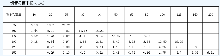 不同流量下不同规格钢管的每百米管路损失可由表2-1中的数值确定。从表上可看出,一定规格的潜水电泵,在额定流量下,扬水管越细,损失越大,扬水越低,扬水管越粗,损失越小,扬水越高。通常扬水管径比泵出水口略大或相等,以减小管路失。