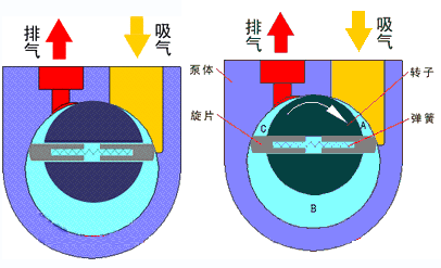 旋片式真空泵主要由泵体、转子、旋片、端盖、弹簧等组成。在旋片式真空泵的腔内偏心地安装一个转子,转子外圆与泵腔内表面相切(二者有很小的间隙),转子槽内装有带弹簧的二个旋片。旋转时,靠离心力和弹簧的张力使旋片顶端与泵腔的内壁保持接触,转子旋转带动旋片沿泵腔内壁滑动。