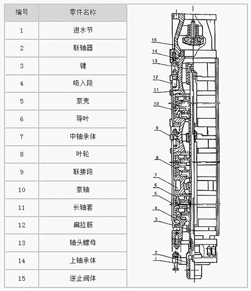 (2)QJ井用潜水泵为单吸多级立式离心泵,潜水电机为充水湿式、立式井用潜水异步电动机,电机与水泵通过筒式联轴器直联。