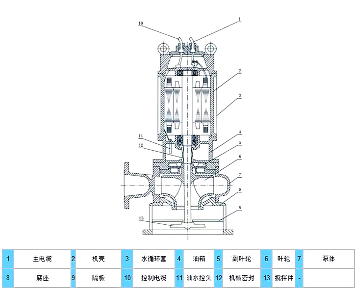 (9)油室内装有油水探头,当机械密封损坏后,水进入油室,探头发出信号由控制系统对水泵实施保护。