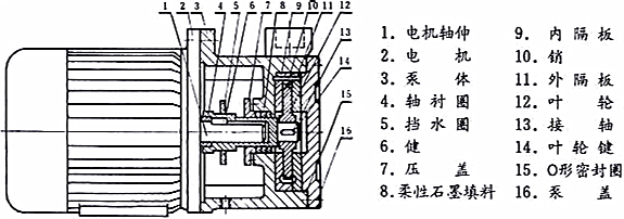 旋涡泵主要由叶轮、泵体和泵盖组成。叶轮是一个圆盘,圆周上的叶片呈放射状均匀排列。泵体和叶轮间形成环形流道,吸入口和排出口均在叶轮的外圆周处。吸入口与排出口之间有隔板,由此将吸入口和排出口隔离开。
